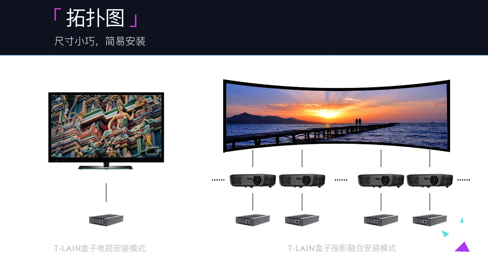 T-LAIN视频播放盒,新一代投影融合系统,架构全面革新,轻量化设计使得投影项目部署变得异常简单。更集中的一体化播控客户端,不仅沿袭了T-LAIN为用户提供高效体验的宗旨,(控制端)更兼顾了平台的扩展型。